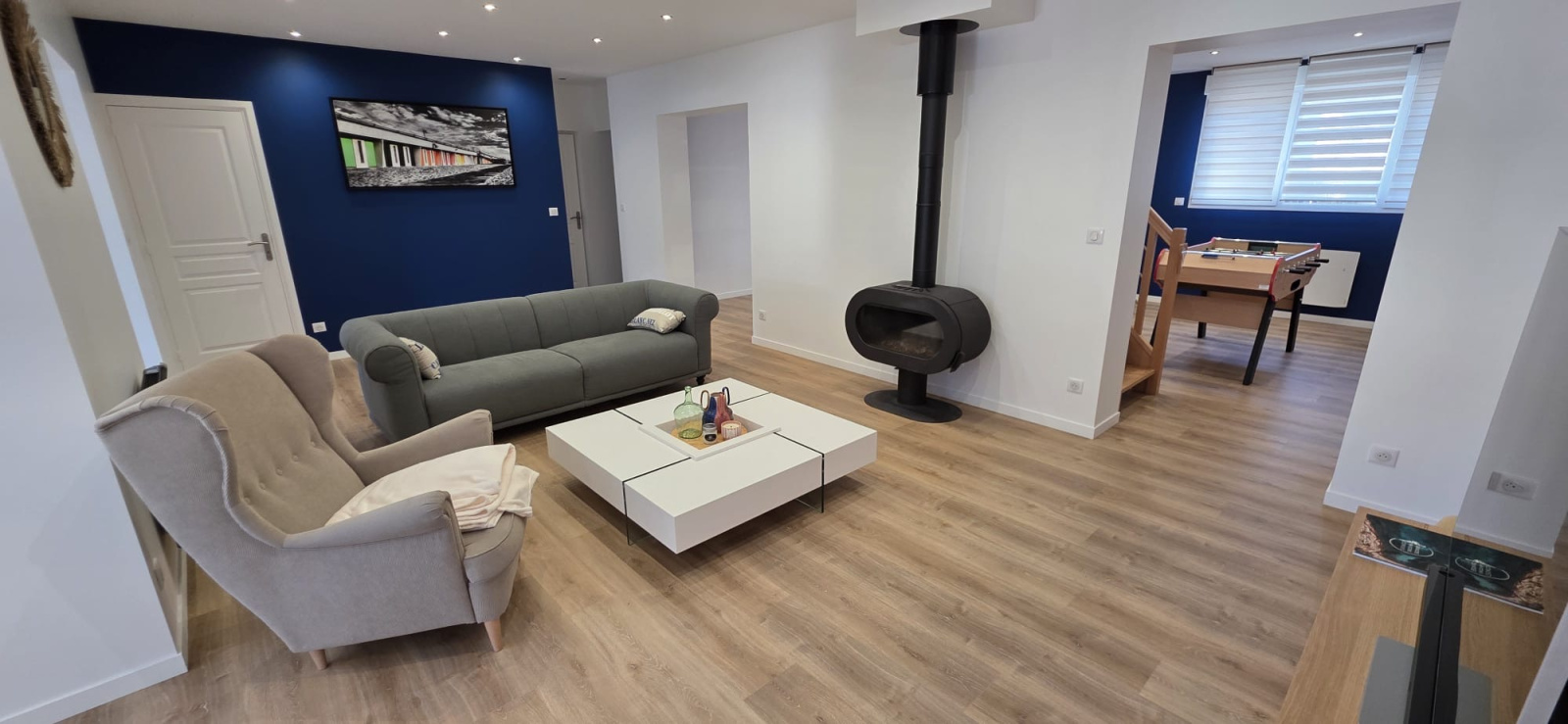 3 belles pièces de vie s'ouvrent les unes sur les autres : salon, cuisine/ espace repas, salle de jeux ou pièce de réception.